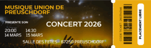 Voir les produits ConcertGrand Concert 2026 – SAMEDI 2,00 € – 10,00 €Plage de prix : 2,00 € à 10,00 € Voir les produits ConcertGrand Concert 2026 – DIMANCHE 2,00 € – 10,00 €Plage de prix : 2,00 € à 10,00 € Ajouter au panier CDCD Musique Union de Preuschdorf – Orchestre d’Harmonie (2016) 13,00 € Ajouter au panier CDCD Musique Union de Preuschdorf – Mélodies du Liebwald (2016) 13,00 €